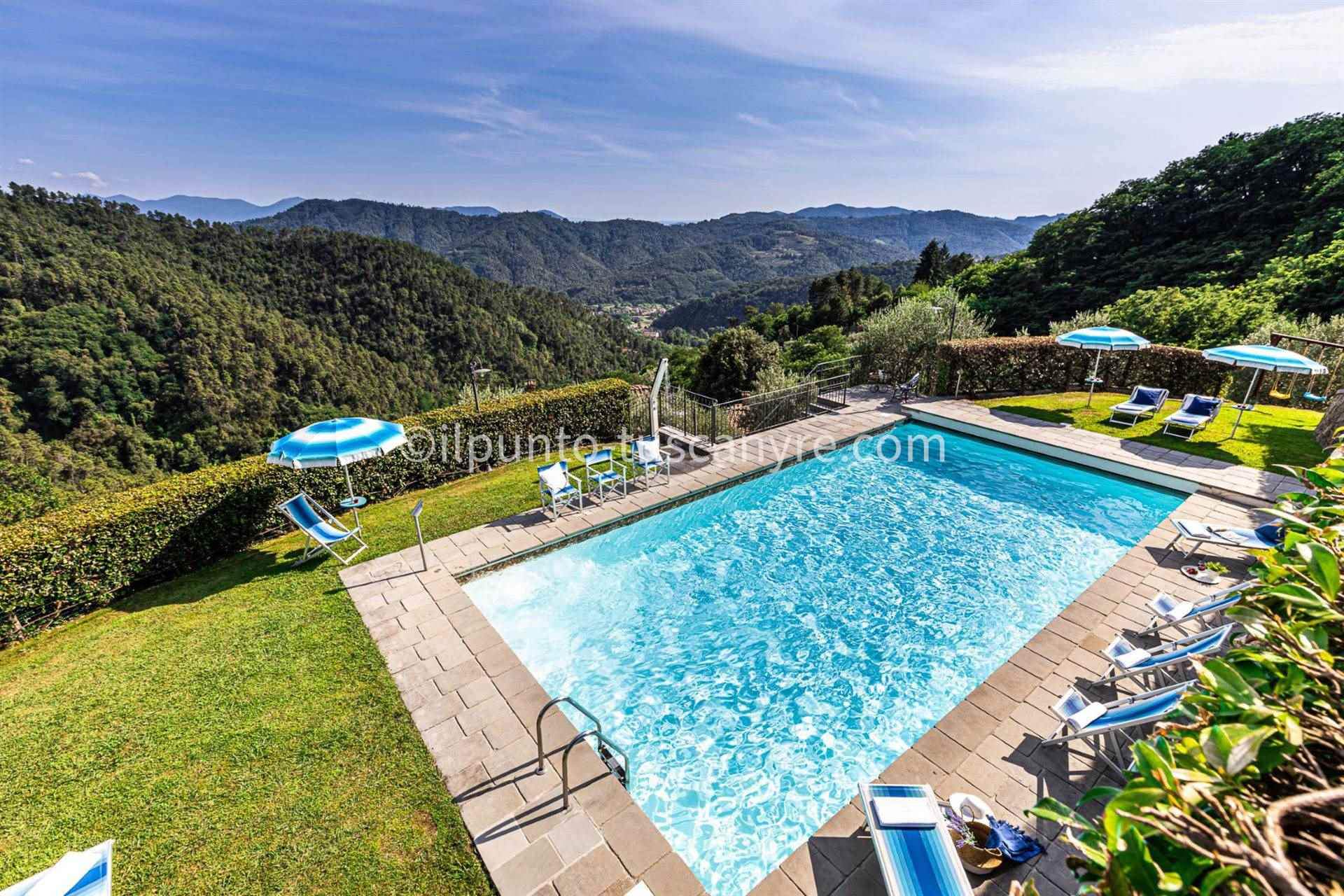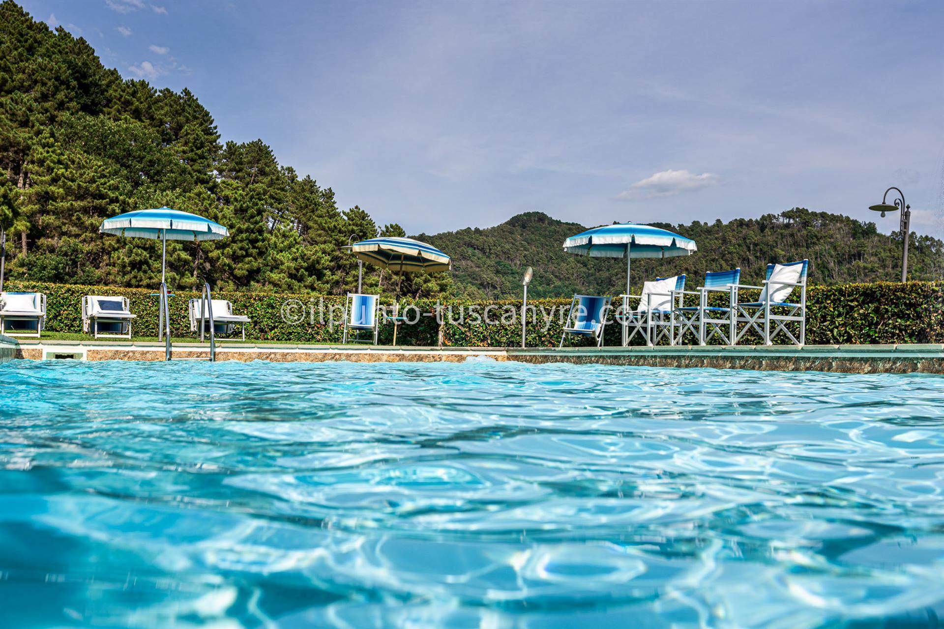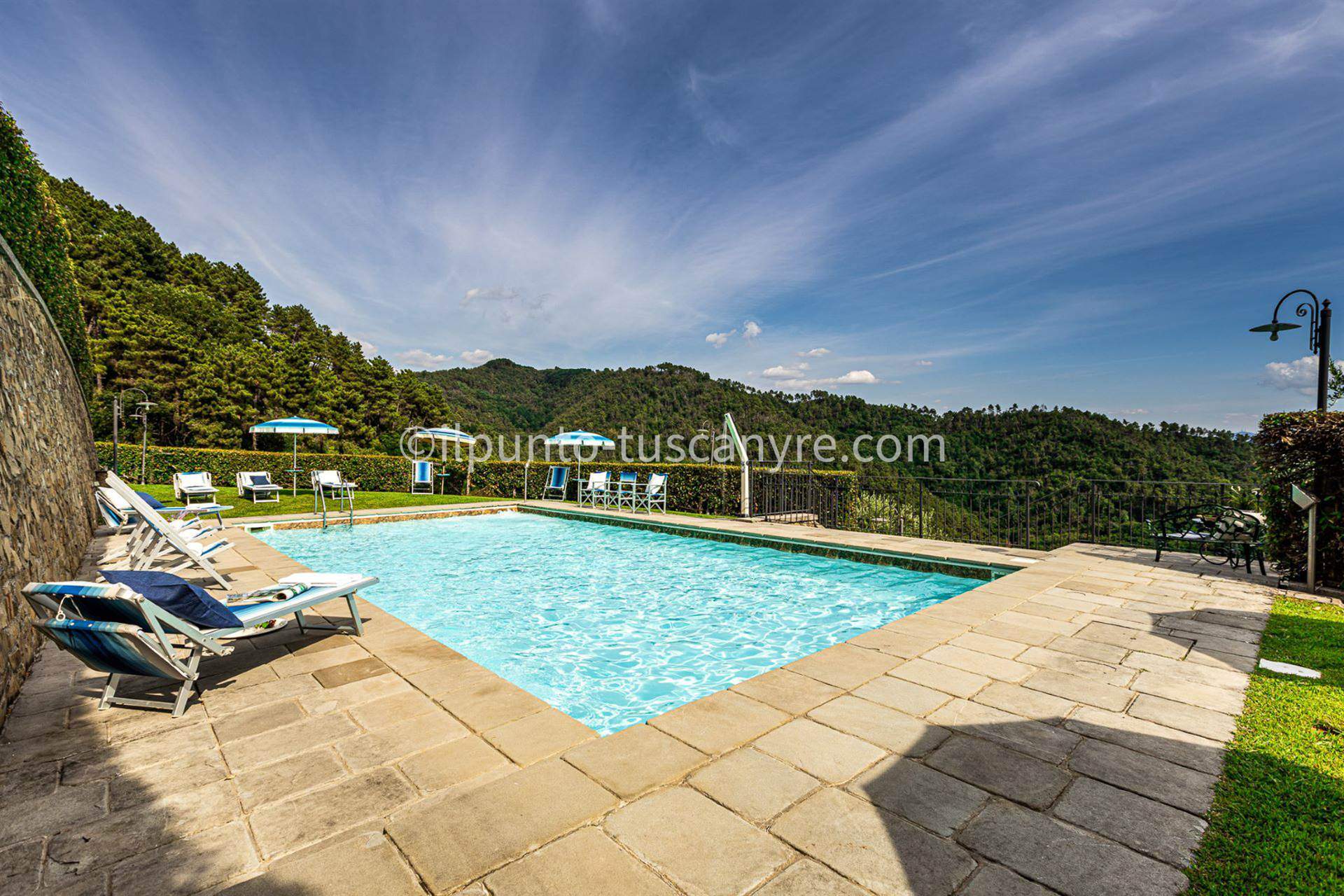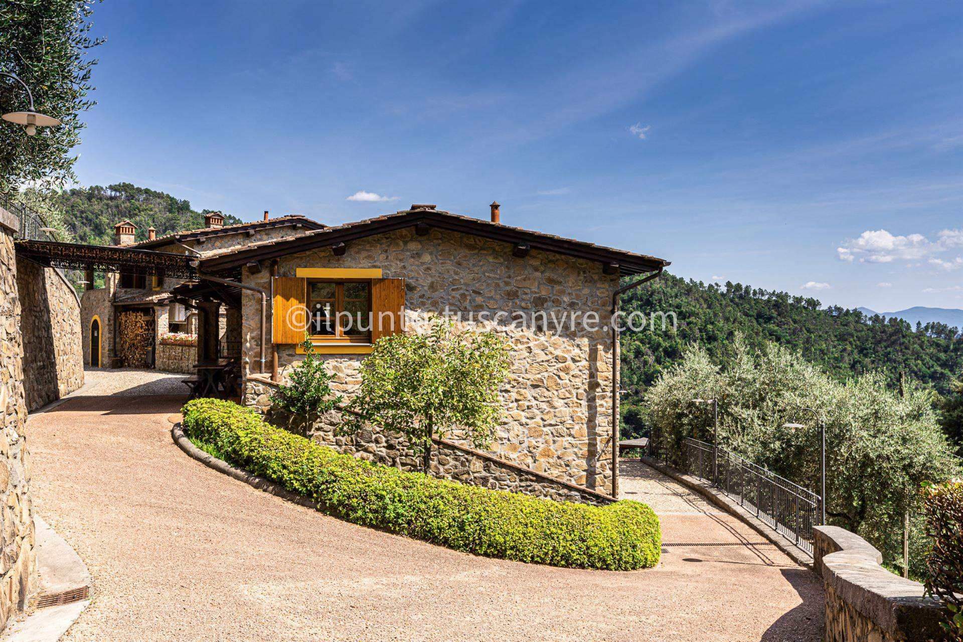PESCAGLIA – [321] – AL COLLE, Enchanting village with swimming pool, for sale on the hills between Lucca and Camaiore, located in a breathtaking location from which you can enjoy a wonderful view of the Lucchese plain. The property consists of two buildings for a total of sqm. 467 and with swimming pool in the well-kept park with olive grove, all about 2.5 hectares. Access to the property is through a private paved road that runs along part of the olive grove property and arrives at the large parking area. The two buildings located on top of a beautiful hill are currently divided into four apartments, while on the left, in a slightly lower terrace, there is a large garage for 2 cars. The buildings, originally from 1800, were totally renovated in 2000, trying to maintain the typical Tuscan style, in fact they have stone structure, terracotta floors, ceilings with wooden beams, bricks and original fixtures. Each unit has its own private outdoor area with barbecue and divided by furniture in dining areas and relaxation areas and the property is surrounded by a well-kept garden. The houses are composed of a minimum of two rooms to three bedrooms, bathroom, living area and kitchen. All of this is accompanied by a beautiful wood-burning oven, laundry area, cellar, storage rooms and large garage. Externally a pergola for dining outdoors with barbecue and not far from the buildings, on a terrace in an elevated position, is located the area dedicated to the pool. The pool is unique, with views over the valley and protected by the surrounding hills, where the ancient Pievi stand out giving unique views to anyone who relaxes in the surrounding solarium. The property for sale in Tuscany enjoys a unique charm and a privileged position; therefore, it is an excellent investment both for those who want a typically Tuscan holyday home, surrounded by nature but not too isolated, and for anyone who wishes to make it their main dwelling with the possibility of using a part of it as an accommodation business. DISTANZE: -Lucca km 13 -Versilia coast km 20 -Pisa Airport km 40 -Firenze Airport km 83 PLEASE NOTE: For privacy reasons, geolocation indicates the area, but not the exact address.