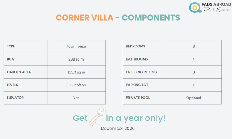 CORNER TOWNHOUSE – LONG BEACH A rare corner townhouse offering generous space, modern design, and excellent accessibility in the prestigious Long Beach area. Designed for comfortable family living or high-return investment, this home combines privacy, outdoor space, and flexible payment options. PROPERTY DETAILS • Type: Townhouse (Corner Unit) • Built-Up Area (BUA): 288 sqm • Total Area: Approx. 403 sqm • Private Garden Area: 115.3 sqm • Levels: 3 Floors + Rooftop • Elevator / Lift: Yes • Bedrooms: 3 • Bathrooms: 4 • Dressing Rooms: 3 • Parking Spaces: 1 • Private Pool: Optional • Beach Access: Yes FLOOR PLAN LAYOUT Ground Floor • Open-plan living and dining area • Kitchen area • Guest bathroom • Direct access to the private garden • Access from private parking First Floor • Two spacious bedrooms • En-suite bathrooms • Comfortable circulation with stairs and elevator Second Floor • Master bedroom with en-suite bathroom • Dressing room • Private terrace for added privacy Roof Floor • Large open rooftop terrace • Ideal for entertaining, sunbathing, or outdoor lounge • Optional customization possibilities LOCATION • 10 minutes from Hurghada International Airport • 5 minutes from Senzo Mall • 15 minutes from Sahl Hasheesh • Only 5 minutes to the sea PRICES & PAYMENT OPTIONS Original Price • EGP 17,754,000 • €319,360 • £275,683 Cash Price (Special Discount) • EGP 12,427,800 • €223,555 • £192,978 6-Year Payment Plan – Special Price • EGP 15,978,600 • €287,425 • £248,115 Down Payment – 10% • EGP 1,597,860 • €28,742 • £24,811 Quarterly Installments (Every 3 Months) • 24 installments • EGP 599,198 per installment • €10,778 per installment • £9,304 per installment DELIVERY • Get in within 1 year • Expected Delivery: December 2026 This corner townhouse offers an exceptional balance of space, privacy, location, and flexible pricing a strong option for both end-users and investors. Optional Extras • Furnishing packages available • Multiple styles and budgets Contact Us PadsAbroad Real Estate • Yasmin (UK): +44 7429 368 398 • Ramy (Egypt): +20 100 103 0661 • Email: info@padsabroad.net • Website: www.padsabroad.info Please note: •Prices and availability are subject to change due to currency exchange fluctuations and market conditions. •Availability changes daily, so securing the best option early is recommended. •At PadsAbroad, we value your privacy your personal data is never shared with developers or third parties for marketing, sales, or cold calling purposes.